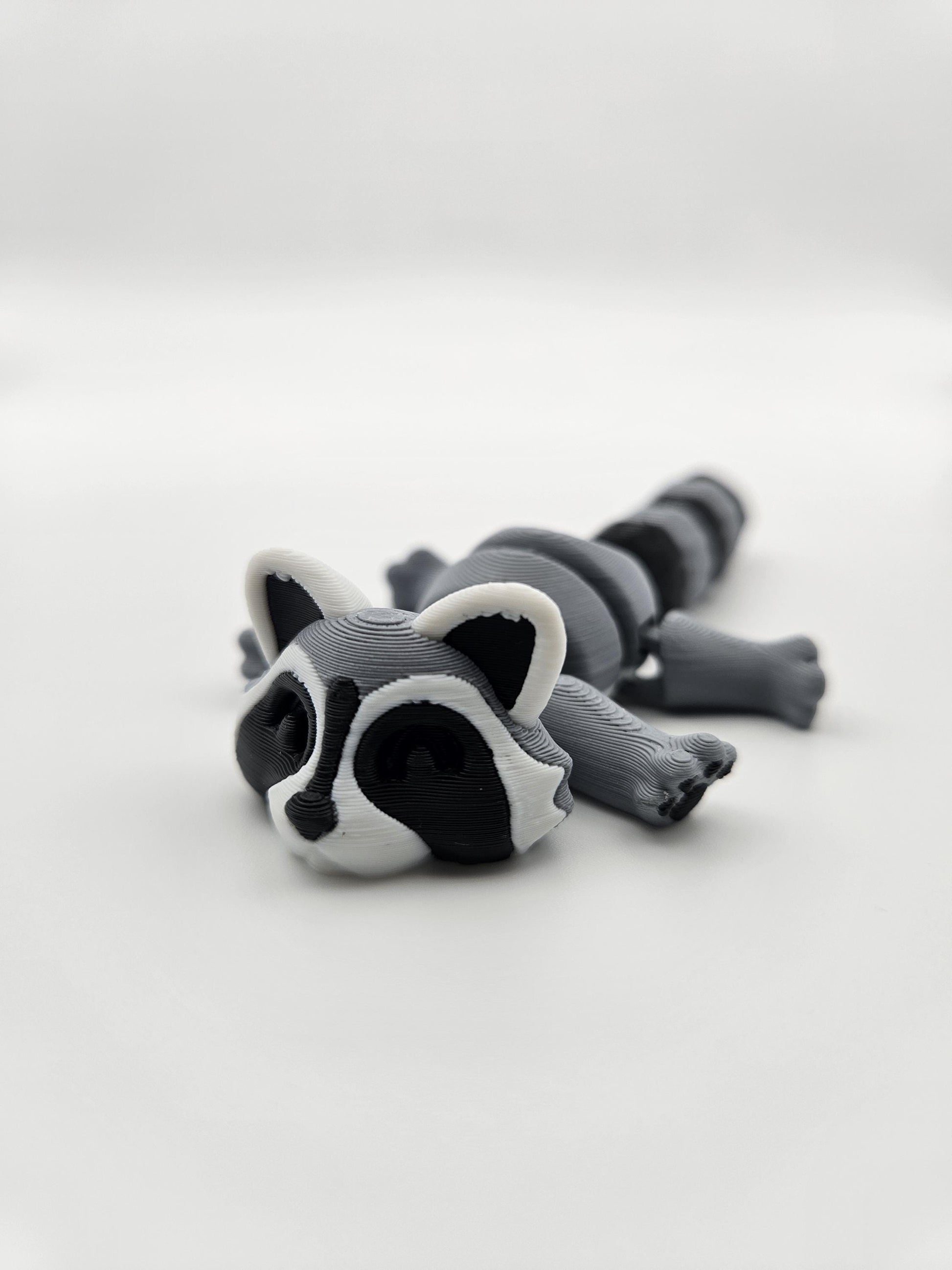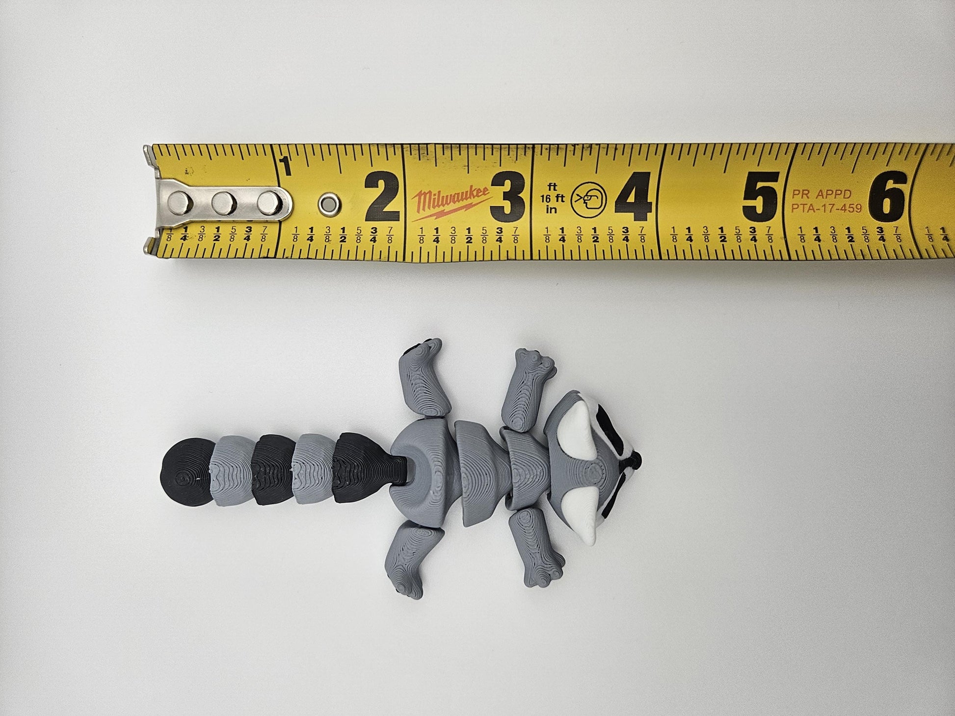 These fidget articulating Trash Panda (Racoon) are ~4 inches in length and super fun! They are super fidgety and articulate very well.